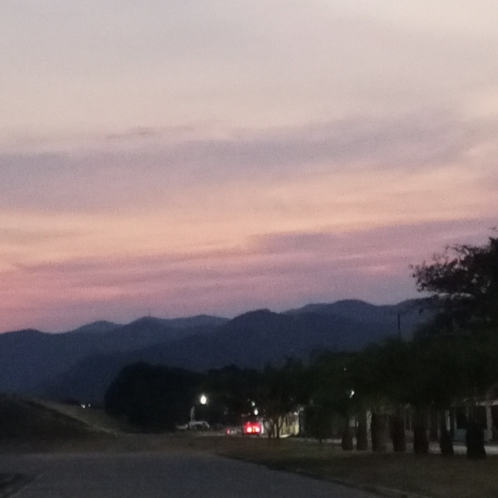 A wide shot depicts a twilight landscape. Layers of mountains fade into the horizon beneath a soft, pastel-colored sky. The immediate foreground features a road leading toward a line of trees and buildings illuminated by streetlights. A vehicle with illuminated tail lights is also visible in the scene.
