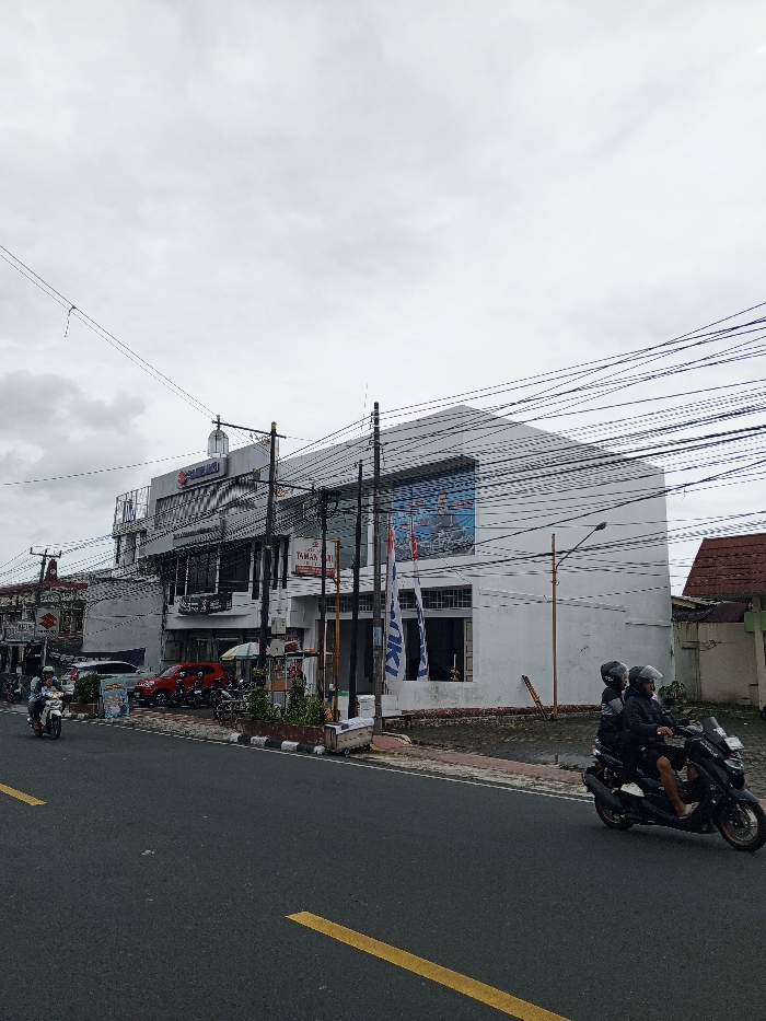 A Suzuki dealership stands prominently with its white facade and Suzuki signage. Cars and motorcycles are parked near the building's entrance. Power lines crisscross the sky above the structure. A motorcycle carrying two people drives along the road, defined by a yellow line. The sky is overcast, suggesting a cloudy day.