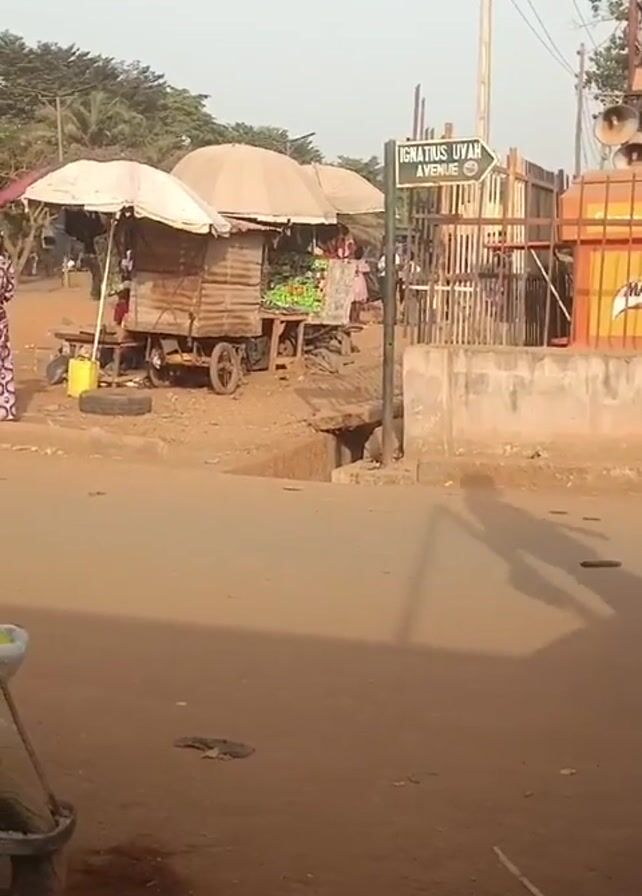 dusty street corner in what appears to be a market area. There are three wooden carts with umbrellas set up as stalls, presumably selling goods. People are standing around the stalls. A woman in a patterned dress stands near the stalls, seemingly observing the scene. A motorcycle with three people on it drives past the camera. A metal cart filled with what looks like green and yellow fruits is parked in the foreground. A street sign for Ignatius Uvah Avenue is visible. The environment looks somewhat poor, with dirt roads and basic infrastructure.