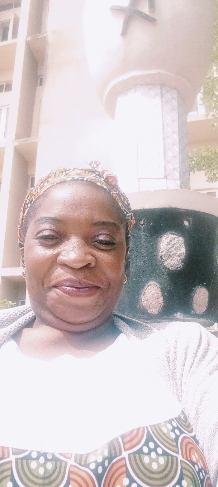 The image presents a headshot of a Black woman, positioned centrally in the foreground, looking directly at the camera with a closed-mouth smile. She wears a multi-colored patterned headwrap, a white shirt, and a light-grey textured cardigan. Gold-colored hoop earrings are visible. In the background, to the subject's left, a light-colored multi-story building with multiple windows is partially visible. To the subject's right, a dark, cylindrical or block-like object with several light-colored circular indentations is present. Above this object, a large, light-colored, possibly concrete, abstract sculpture features a prominent dark 'X' shape on its upper section and rests on a textured column. The scene is outdoors in Kabala, Nigeria, under bright, somewhat overexposed, daylight conditions.