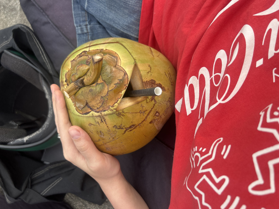 The image depicts a close-up, high-angle view of a person's lap and left hand resting on a beverage. The person's left hand, with a silver-colored ring on the ring finger, is placed on a green-yellow coconut. The coconut has a carved opening on its upper side, into which a dark grey drinking straw is inserted. The coconut rests on the person's lap, which is covered by a red t-shirt featuring the white "Coca-Cola" script logo and stylized white human figures, consistent with Keith Haring artwork. Dark blue denim fabric is visible to the right of the coconut. In the upper left background, parts of a dark motorcycle helmet with a green interior lining and dark fabric, possibly a bag or jacket, are visible against a light grey surface, likely concrete or asphalt. The location is undetermined within the city of Unknown, Unknown.