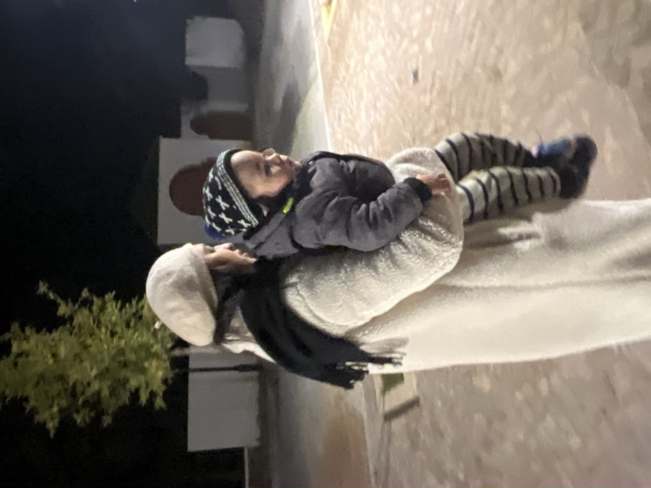 A woman in a white beret and black scarf carries a young child. The child wears a knit hat with stars, a jacket, and striped pants. They appear to be outside at night, with a dark sky and illuminated building in the background. Trees are visible on the left. The perspective is slightly tilted.