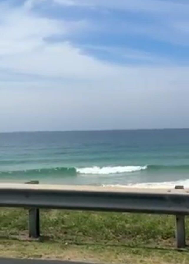 coastal scene, likely filmed from a moving vehicle as evidenced by the road and guardrail in the foreground. Beyond the barrier, there is a strip of grass, followed by a beach and the ocean. The sky is blue with scattered white clouds. The ocean is a mix of deep blue and lighter turquoise shades, with small waves breaking near the shore. Two figures, possibly surfers, are visible in the water.