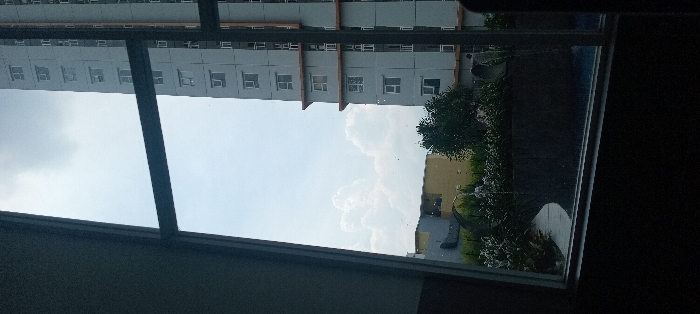 A view from inside looking out through a window. The window frame is dark and obscures parts of the scene. Outside, a tall, gray building with many windows faces the viewer. In the middle ground, trees and other greenery provide a glimpse of a garden or landscape. The sky is visible, filled with white clouds. A portion of another building is visible, painted yellow.