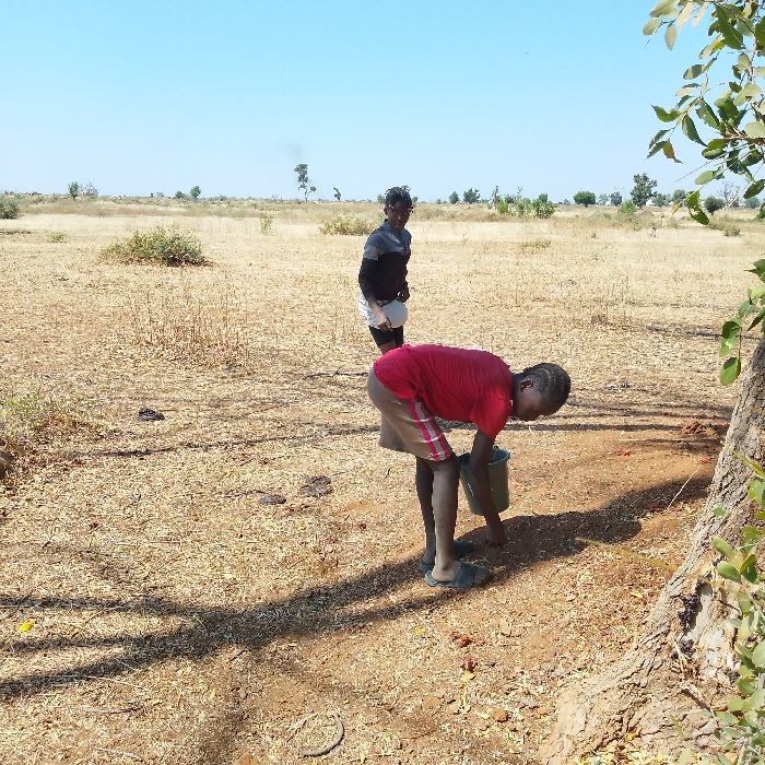 The image depicts an outdoor scene in Numan, Nigeria, under clear blue skies and bright daylight. Two individuals are present in a dry, open field characterized by reddish-brown soil and sparse, parched straw-colored vegetation. In the foreground, a young individual, likely male, with dark skin and braided hair, is bent at the waist, facing slightly left. This individual wears a red short-sleeved t-shirt, light brown shorts with red stripes on the sides, and dark flip-flops. Their right hand is positioned near a small, dark grey bucket resting on the ground. Long shadows from a prominent tree trunk on the immediate right extend across the foreground. Approximately ten feet behind the foreground subject, another young individual, also likely male, with dark skin and dark hair, stands upright, facing the viewer. This individual wears a long-sleeved shirt, dark grey or black with lighter grey sections on the sleeves and shoulders, and light-colored shorts. A light-colored object is held near their left hip. The background consists of more dry, open terrain with scattered small bushes and a few distant trees along the horizon. The overall environment appears arid, consistent with a dry season.