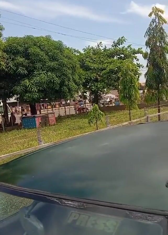 view from inside a car with a "PRESS" sticker on the windshield. The car appears to be parked or moving slowly. The exterior view reveals a roadside scene with trees, a grassy area, and a metal fence separating the foreground from a road with some commercial buildings. Some people are visible near the side of the road. The buildings feature colorful facades and signs, including "THERMO COOL SHOWROOM" and "LONTOR." The sky is partly cloudy.