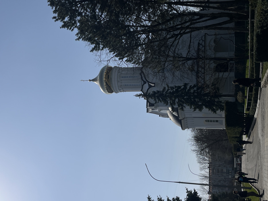 The image depicts the Church of the Holy Great Martyr George the Victorious, located at Mitrofana Sedina St, 172, Krasnodar, Russia, under clear, bright daylight. The prominent structure is a white Eastern Orthodox church featuring a large, central golden onion dome topped with a gilded Orthodox cross, rising above a multi-tiered octagonal drum. A smaller, darker dome is visible to the left of the main dome. The church facade exhibits arched window elements and decorative white architectural details. In the foreground and midground, a light-colored paved pathway curves from the lower left towards the background. Approximately ten individuals are present on or near this pathway. Most are walking, singly or in small groups, generally moving away from the viewer towards the background. They are dressed in casual outerwear. One individual, wearing a dark coat and carrying a bag, stands near the right edge of the paved area, facing the church grounds. The church is surrounded by greenery, including manicured hedges and lawns. Numerous tall, dark green coniferous trees, possibly pines or cypresses, partially obscure the right side of the church structure. Deciduous trees with bare branches are visible further in the background. A tall streetlight pole is present on the left side of the path. In the distant background on the left, several multi-story buildings, possibly residential or commercial, are visible. The sky is clear and bright blue, with sunlight casting shadows.