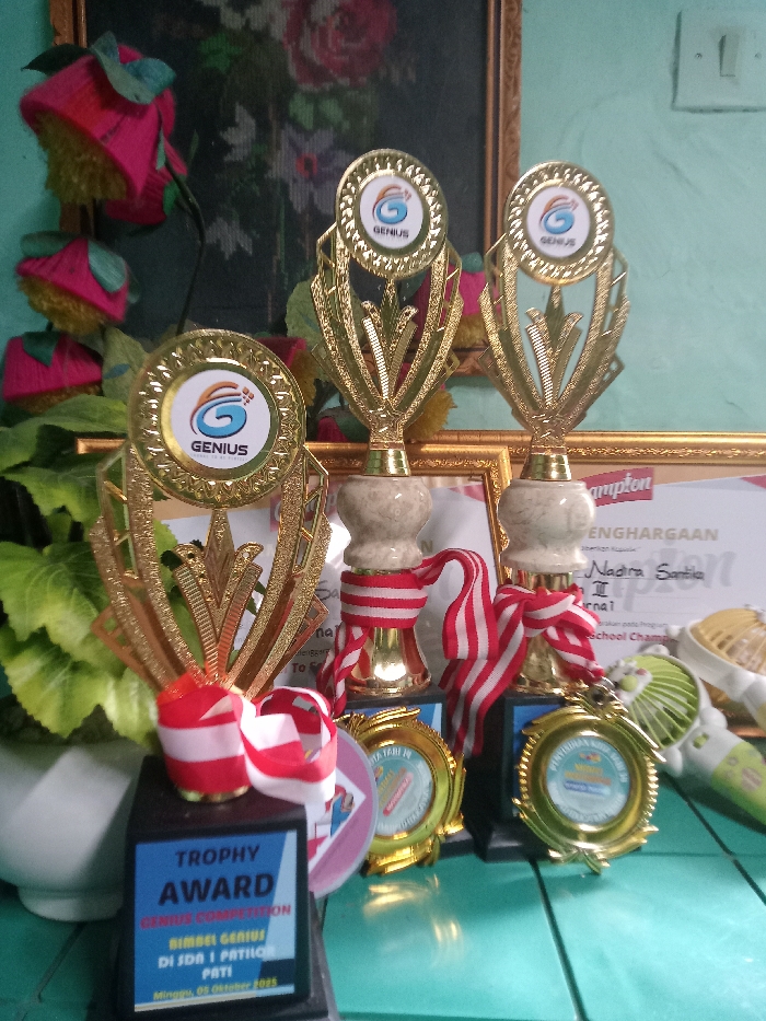 Three gold-colored trophies with the "GENIUS" logo stand on a blue surface. The trophy on the left has a ribbon tied to it and a base with text indicating it's a "TROPHY AWARD" for a "GENIUS COMPETITION" organized by "BIMBEL GENIUS" at "SDI I PATHOR PATI" on "Minggu, 05 Oktober 2025". Two medals are displayed in front of the trophies. Behind the trophies, a framed certificate with the word "ENGHARGAAN" visible and a framed embroidered picture adorn the scene, along with artificial plants.