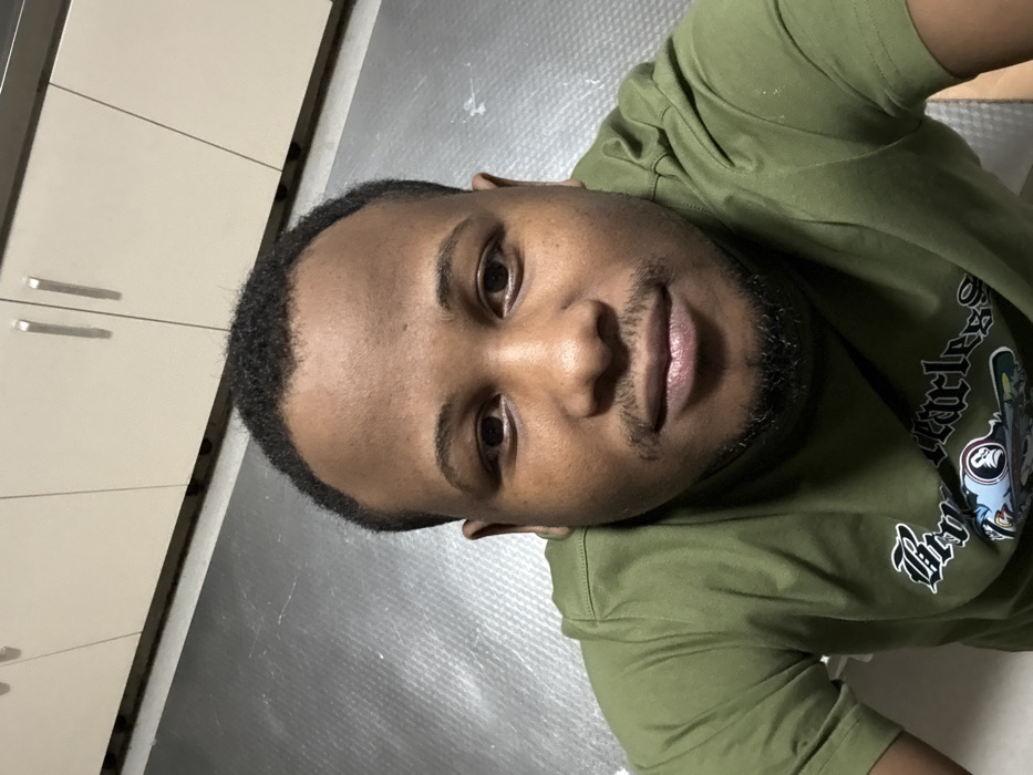 The image displays a close-up, head-and-shoulders portrait of a single adult male, facing directly towards the camera. The individual has dark skin, short dark curly hair with a defined hairline, and a dark mustache and goatee. He is wearing a short-sleeved olive green t-shirt that features a partially visible graphic design on the chest, including text that appears to read "Fearless" and a cartoon character resembling an ape or gorilla. The subject exhibits a neutral to slightly smiling facial expression. The background suggests an indoor utilitarian setting. In the upper portion, behind and above the subject's head, are light-colored cabinets or storage units with silver-toned vertical handles. Beneath these units, and forming the background across the lower half of the frame, is a dark gray or black surface with a faint textured pattern, possibly a counter or floor. The lighting is even and appears to be artificial ambient light. The image contains no identifiable landmarks or features to confirm the stated location in Daxing District, China.