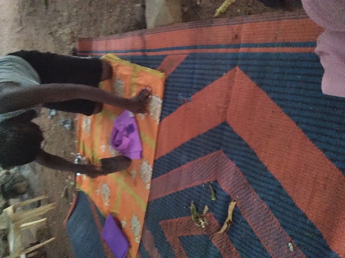 A person is crouched on a patterned mat with orange and blue stripes. They are positioned near an orange cloth with white patterns and several small purple items. Some loose plant matter rests on the mat near the orange cloth. The setting is somewhat indistinct, with hints of an outdoor area and some wooden objects nearby.