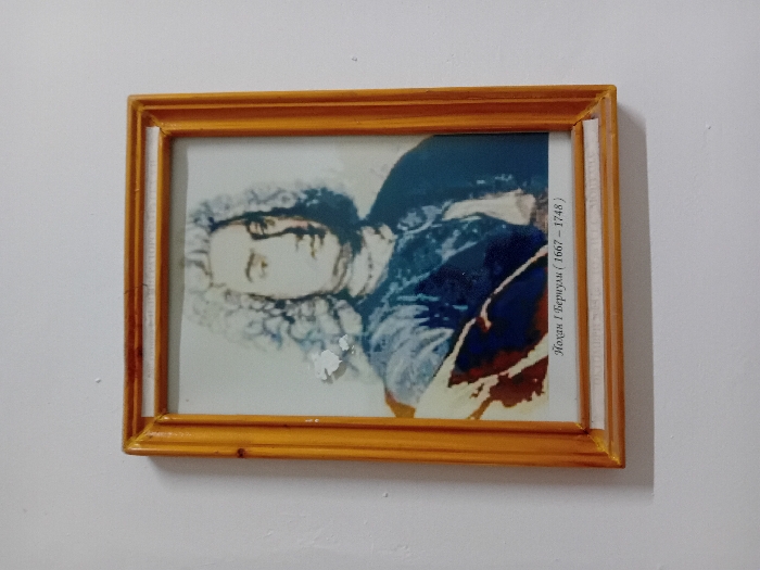 A rectangular, light brown wooden-framed portrait is affixed to an off-white painted wall in Sliven, Bulgaria