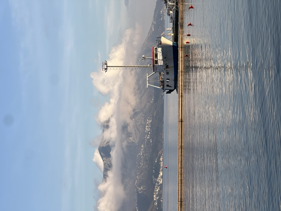 The image depicts a coastal harbor scene in Budva, Montenegro. The foreground shows calm, reflective blue-gray water with gentle ripples. A light-colored concrete pier or breakwater extends horizontally across the middle of the frame. Moored to the pier on the right is a white vessel with a blue hull stripe and a red cabin roof. This vessel features a tall, slender mast with a ladder extending vertically from its deck, topped by a platform. To the immediate right of this vessel, a portion of a smaller white boat is visible. Four orange-red spherical buoys are present in the water in front of the main vessel, positioned in a line. The background reveals a mountainous coastline. Numerous light-colored buildings are scattered along the base of the mountains, which are partially obscured by white cumulus clouds. The sky above is clear and light blue, with some scattered thin clouds. A single red cylindrical buoy floats in the distant water towards the left, near the visible coastline. The scene is illuminated by natural light, casting subtle shadows. No human figures are present.