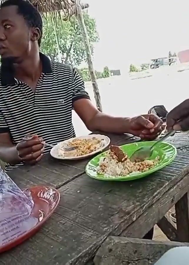 Two people are seated at a weathered wooden picnic table, eating plates of food. One person is visible in the video, wearing a black and white striped polo shirt. The other person's hands are visible, using a spoon to move food around on a green plate. Two other plates of food and a bag are also on the table. A person wearing a red shirt and yellow and black patterned skirt is standing in the background. The scene appears to be outdoors near a body of water.