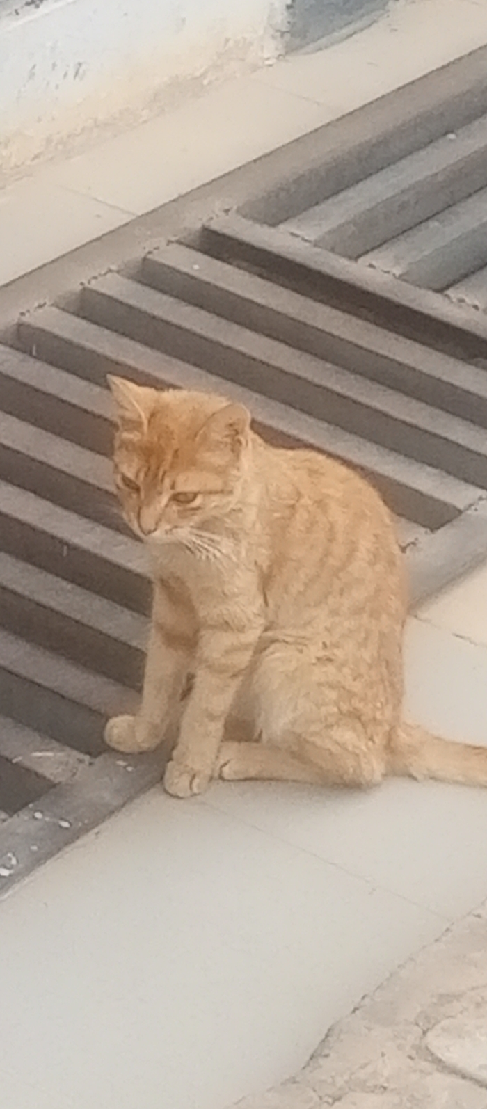 An orange tabby cat sits on a light-colored tiled surface beside a dark grey metal grate. The cat is positioned with its front paws on the tile, looking downward. Its fur has darker stripes and lighter patches. The cat's tail extends behind its body along the tile. The grate appears to be a part of a drainage system. The background is blurred, suggesting a shallow depth of field.