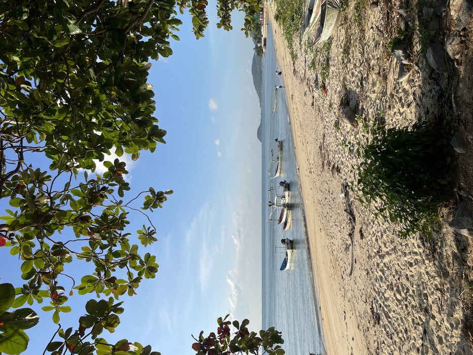 The image depicts a sunny coastal scene in Nathon, Thailand. The view is framed from an elevated perspective by dense green and reddish foliage overhead, likely from a large tree. A clear, light blue sky with sparse white clouds occupies the upper portion. Below, the calm, light blue-green sea extends to the horizon, dotted with five traditional Thai fishing boats with longtail engines, anchored in the shallow water. The sandy beach, light tan in color, stretches from the foreground into the distance. In the immediate foreground, a small green bush grows on the sand, surrounded by rocks and scattered debris. Further down the beach on the right, two small, worn wooden boats are pulled onto the sand, accompanied by low-lying green vegetation. Two human figures are visible walking in the shallow water near the shoreline approximately midway down the beach on the right side of the frame. The distant coastline features a prominent green hill or small mountain rising from the sea, with indistinct buildings and structures visible along the far shore. Bright sunlight illuminates the scene, casting shadows from the foreground foliage and objects on the sand.