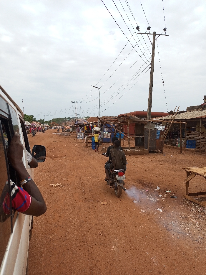 street scene in Idah, Nigeria, located at latitude 7.106, longitude 6.729. The scene is characterized by a dirt road lined with simple structures on either side. The road appears to be a main thoroughfare, with several people walking and driving along it. In the foreground, a white van is partially visible, with an arm and hand of an individual, likely the driver, extending out of the open window. The individual is wearing a red and black striped shirt. Behind the van, a young male adult on a motorcycle drives forward, leaving a trail of smoke from the exhaust. He is wearing a dark-colored jacket and a helmet. In the background, there are various structures, including a small kiosk, a makeshift shop with a blue sign, and a row of huts. The structures are made of various materials, including wood and corrugated metal sheets. The scene is punctuated by numerous power lines and utility poles. The sky is cloudy, suggesting a possible overcast day. The overall impression is of a lively, bustling street scene in a developing urban area.