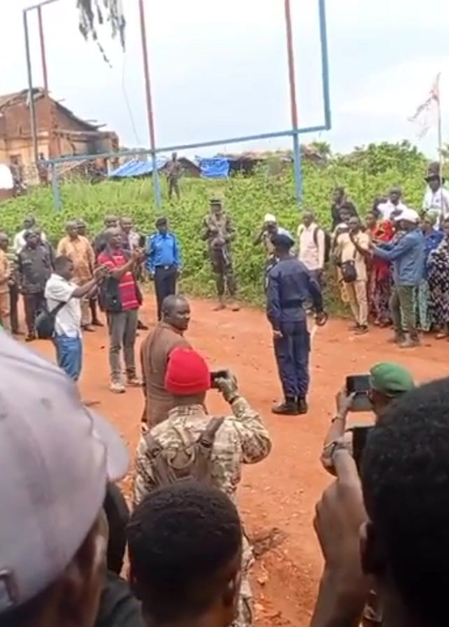 A crowd of people is gathered on a red dirt road. Many are taking pictures with their phones. On the right, a group of people are holding flags and a banner that reads "La Dynamique Albert Labani, Bougelakaise le Réveil de la Jeunesse et Service du Gouverneur." Two uniformed officers stand in the center of the crowd. Behind the crowd is a dilapidated building and some makeshift shelters. A truck is parked on the left side of the road. The crowd appears to be gathered for a political event.