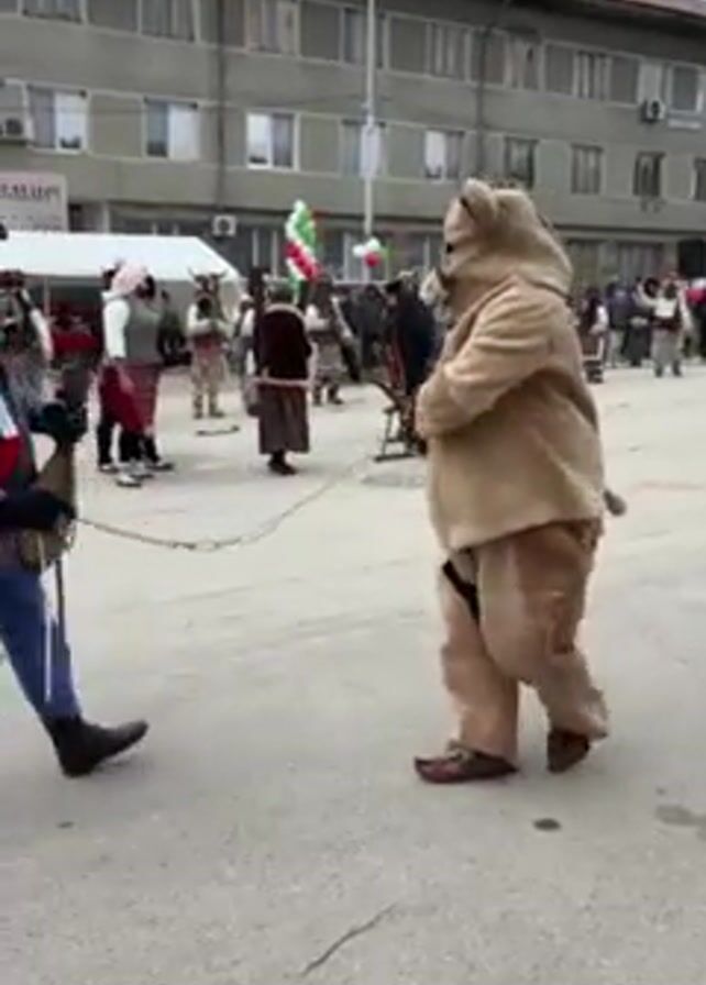 The video captures a street celebration. A person in a bear costume is led on a chain by another person dressed in a blue shirt, vest, and black hat. They stand in a town square or street, with a group of people in the background. The background includes a building, tents, and decorations with the Bulgarian flag. There's an event taking place with music playing. People in traditional costumes can be seen in the background dancing.
