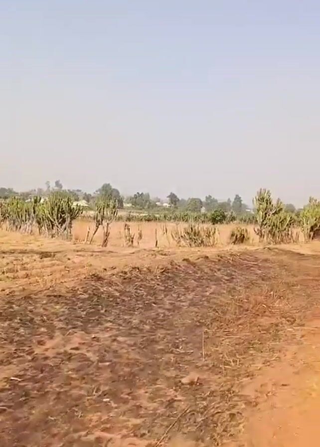 person riding a motorbike on a dusty, reddish-brown dirt road in a dry, rural landscape. The sky is clear and pale blue. On either side of the road are fields of dry grass and stubble, interspersed with rows of tall, green cacti. The camera appears to be mounted on the motorbike, providing a first-person perspective of the ride. As the bike moves, dust is kicked up. In the distance, there are some buildings and trees, indicating a settlement. The overall impression is of a dry, arid environment.