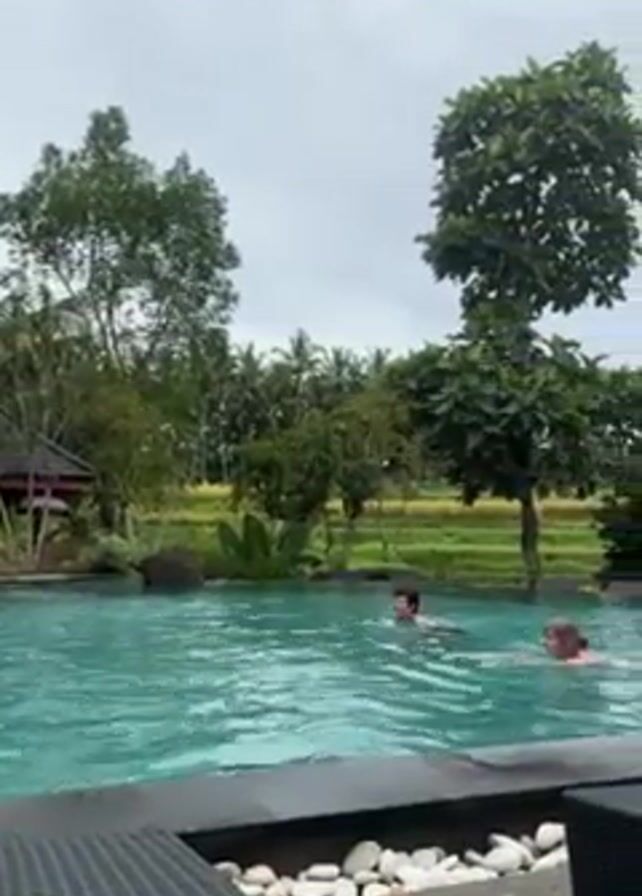 A person is sitting on a lounge chair next to a turquoise swimming pool. The person’s feet are visible in the foreground, and they appear to be resting and relaxing. In the pool, another person is swimming, moving from the right side towards the center. The pool is surrounded by greenery, including trees and plants, and a small building with a traditional thatched roof can be seen on the left. Behind the pool and the trees are rice terraces that ascend the landscape, with palm trees visible on the horizon under a cloudy sky. The camera angle shifts slightly, revealing more of the pool and the surrounding landscape, as well as a large rock feature incorporated into the pool’s edge. The general atmosphere is calm and peaceful.