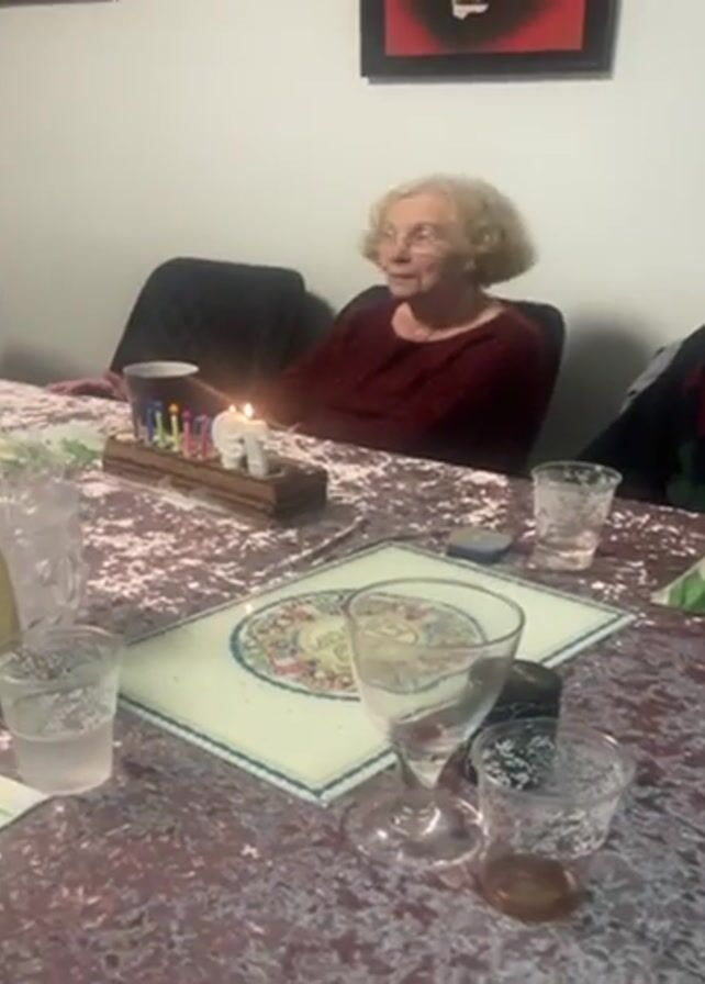 woman with short, curly blond hair sitting at a table during what appears to be a celebration. She is wearing a maroon top and gesturing with her hands as she speaks. The table is covered with a patterned cloth and holds several glasses, some filled with liquid. At the center of the table, there is a menorah with several lit candles. There is an ornate square coaster on the table as well. Paintings adorn the wall in the background. The scene is brightly lit. Other people are seated around the table, but they are partially out of frame.