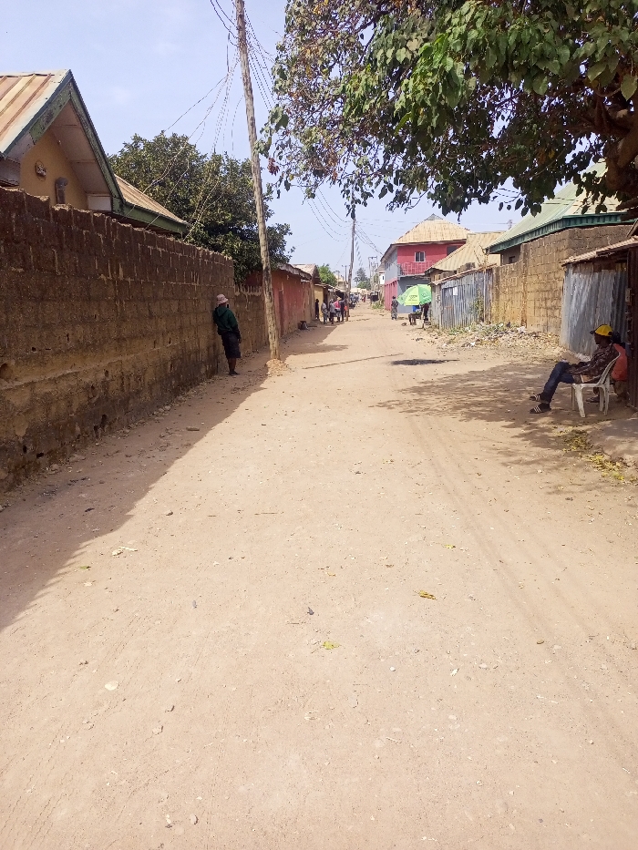 The image displays an unpaved residential street in Sabon Tasha, Nigeria, under clear, bright daylight