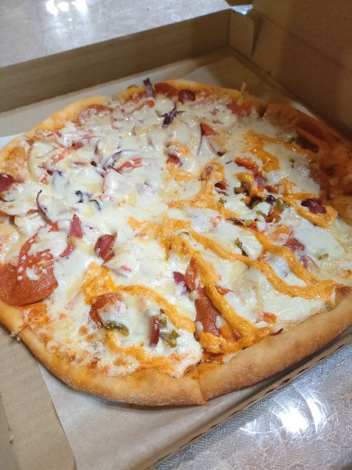 - "A whole pizza sits inside a partially open cardboard box" by FM-jApwm1, licensed under CC BY 4.0