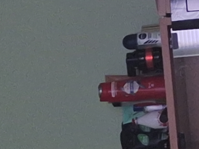 The image displays a static, medium-shot view of a wooden shelf containing an arrangement of personal care items, positioned against a textured, light green-grey wall. No individuals, actions, or interactions are depicted. The precise location within Sheremetia, Bulgaria, is not discernible from the visual evidence. From left to right on the wooden shelf, the following objects are observed: 1. A dark, indeterminate object, possibly a fabric container or bag, with a luminous green accent visible on its left side. 2. A white, tapered plastic bottle featuring a red and blue label near its base, possibly a cosmetic or cleaning product. 3. A smaller, translucent bottle topped with a blue cap, positioned behind the white bottle. 4. A prominent, tall, cylindrical red bottle, consistent with a shower gel or shampoo container, displaying a white label with a blue emblem in the center. 5. A dark, rectangular object with a distinct horizontal red band across its middle, located to the right of the red bottle. 6. A black-capped roll-on deodorant bottle, identifiable by its white label and "Nivea" branding in black lettering. 7. A light-colored, rectangular object, possibly a book or small box, partially obscured behind the deodorant bottle. Below the wooden shelf, segments of what appear to be metallic or white plastic fixtures are partially visible, suggesting the presence of a lower shelf or a distinct piece of furniture. The ambient lighting is diffuse, indicative of an indoor setting.