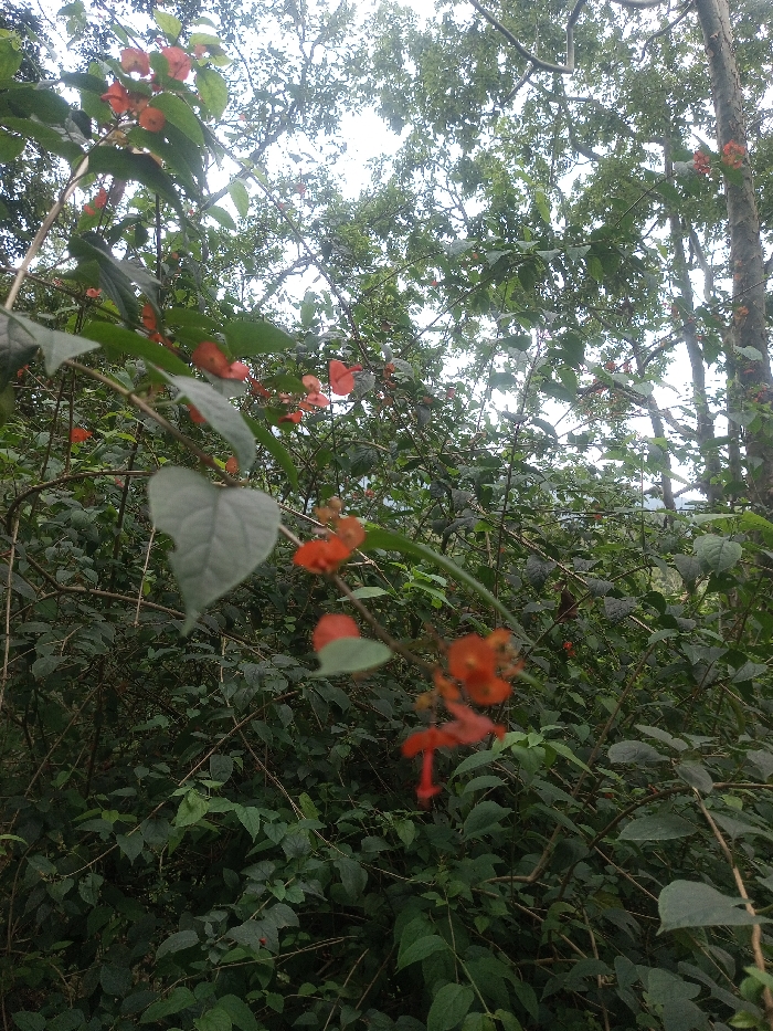 The image presents a dense natural environment in Padegaon, India, characterized by extensive green foliage and flowering plants. In the immediate foreground, several branches with green leaves are visible, some exhibiting a slight blur due to shallow depth of field; one prominent leaf near the left-center is heart-shaped and slightly frayed on one edge. Throughout the foreground and midground, numerous small, bell-shaped flowers, colored vibrant orange-red, are scattered amongst the leaves and branches. The midground consists of a thick concentration of tangled green shrubbery and smaller branches. The background reveals the canopy of larger trees with discernible trunks and branches on the right side, set against an overcast or brightly lit sky. No people, animals, or man-made objects are identifiable within the frame. The scene appears still, under natural daylight conditions.