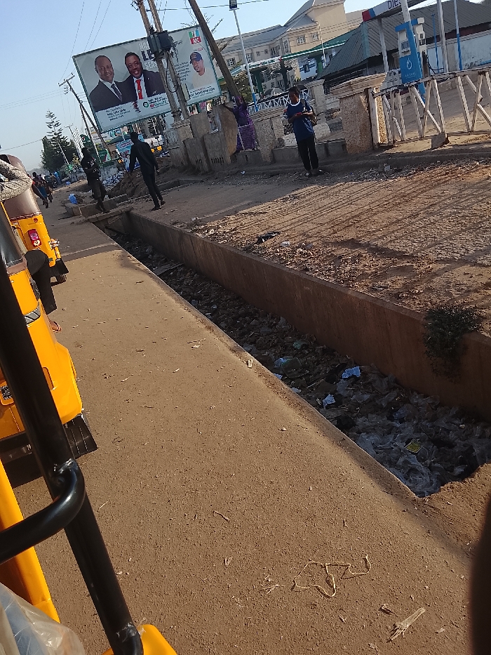 This image captures a sunlit street scene in the city of Television, Nigeria. In the foreground, the left side of a yellow tricycle is partially visible. A wide, concrete-lined drainage ditch runs horizontally through the midground, heavily filled with accumulated plastic bags, bottles, and various refuse. The ground consists of reddish-brown dirt or unpaved road, showing tire tracks and sparse debris. On the far side of the ditch, a narrow unpaved path leads to a street where several individuals are present. One male figure in dark clothing walks left-to-right, crossing a small culvert over the ditch. Another male figure, also in dark attire, stands further right, seemingly engaged with a handheld device. A third individual, wearing purple clothing, is partially obscured behind the base of a large billboard. The prominent billboard features portraits of three men, identified by text as associated with "APC" and "SENATE." Utility poles and overhead wires are visible. In the background, multiple buildings can be seen, including one with a blue roof displaying signage for "Greenville LNG" and "DIESEL." Concrete barriers and low walls line parts of the street. The scene is illuminated by strong sunlight, casting defined shadows.