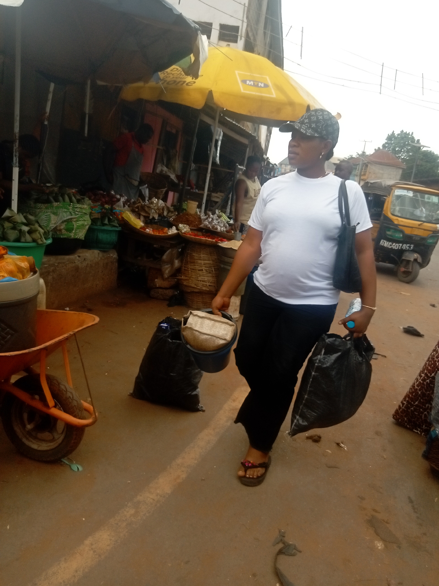 A woman is walking in an open market environment in Nkpor, Nigeria. She is wearing a white t-shirt, black pants, a patterned baseball cap, and sandals. She carries a black shoulder bag, a black plastic bag, a plastic container, and a water bottle. The market has stalls covered by umbrellas, where food items are displayed. Other people are present in the background, and a yellow auto rickshaw is visible on the right. A wheelbarrow is on the left side of the image. The ground is a hard-packed dirt or pavement surface.