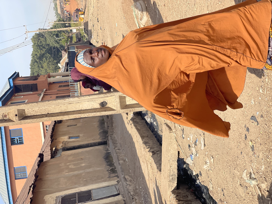 An adult female, estimated 30-40 years old, with dark skin, stands on an unpaved dirt path in Muchiya, Nigeria, looking towards the viewer
