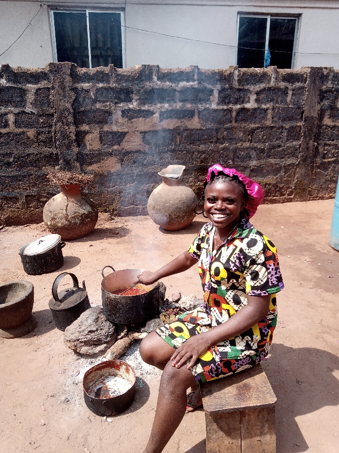 An outdoor scene in Okpatu-Ukehe, Nigeria, features a female individual engaged in open-air cooking