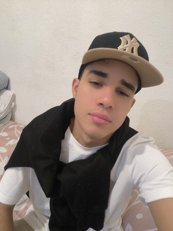 The image depicts a young male seated indoors, facing directly towards the camera. He wears a black baseball cap with a beige brim, featuring a beige "NY" logo on the front. He is dressed in a white short-sleeved t-shirt, with a black long-sleeved garment (possibly a sweater or sweatshirt) draped over and tied around his shoulders. His facial expression is neutral, with his lips appearing slightly pink. The background consists of a plain white wall on the left, with a stack of light-colored, folded fabrics (blue and white) partially visible in the upper left corner. To the lower right, a light-colored fabric with a faint reddish-brown or pinkish-brown patterned design is visible, suggesting a piece of bedding or upholstery. The specific location within the city of Dresden, Germany, cannot be determined from the provided visual information.