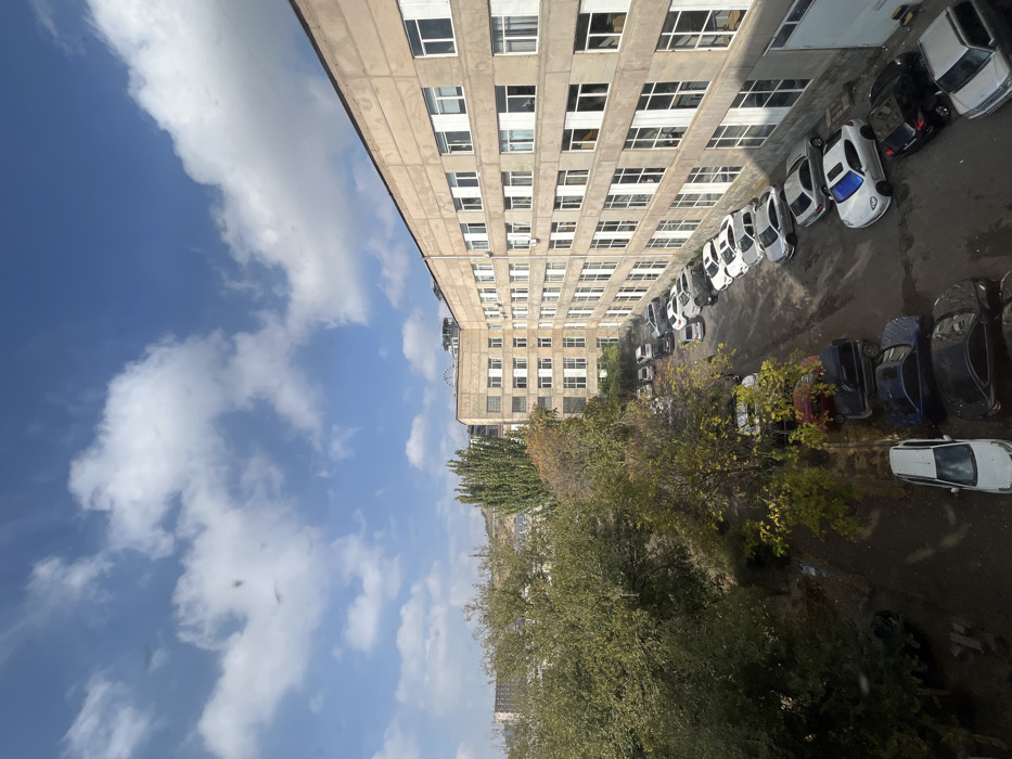 The image displays an exterior view of a multi-story building and an adjacent parking area in Yerevan, Armenia