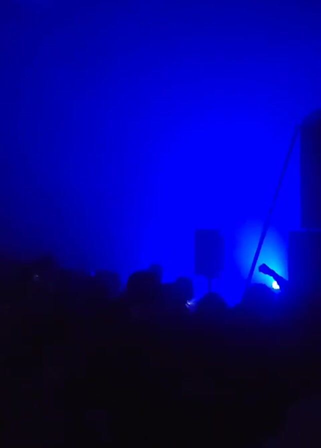 concert stage with a crowd of people in front of it. The stage is bathed in a blue light. There are some speakers and other equipment visible on the stage. A white stand is visible behind the speakers. The crowd is silhouetted against the bright light, and they appear to be enjoying the music.