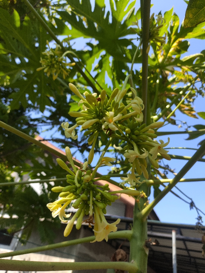 - "A close-up, upward-angled photograph taken in Lhokseumawe, Indonesia, captures clusters of pale yellow papaya (Carica papaya) flowers and buds on a segmented green stem" by FM-miGDx1, licensed under CC BY 4.0