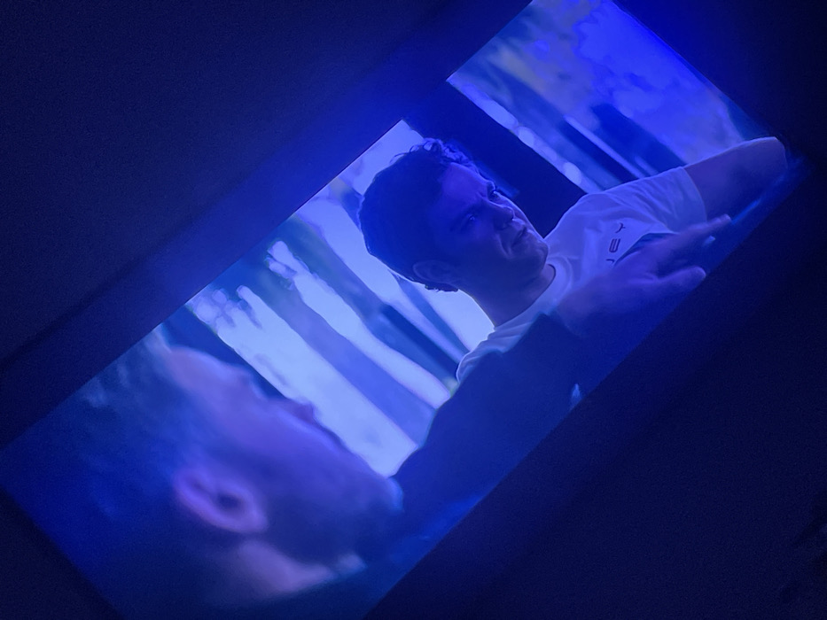 This image depicts a photograph taken in the city of Pazardzhik, Bulgaria. The primary subject is a screen displaying a cinematic or video scene, viewed from a tilted angle in a dimly lit environment predominantly illuminated by blue light emanating from the screen. The screen content features two male individuals. The individual on the left, partially visible from the side, wears a dark long-sleeved garment and extends an arm and hand towards the second individual. The individual on the right, with dark, wavy hair and a serious expression, is shown looking downwards and slightly to his right. He wears a white short-sleeved t-shirt with dark text, possibly "JEY," printed on the chest. The background of the on-screen scene consists of vertical and diagonal light blue and dark blue striped patterns. The dark surroundings visible in the upper right and lower left corners of the photograph indicate the boundaries of the viewing space.