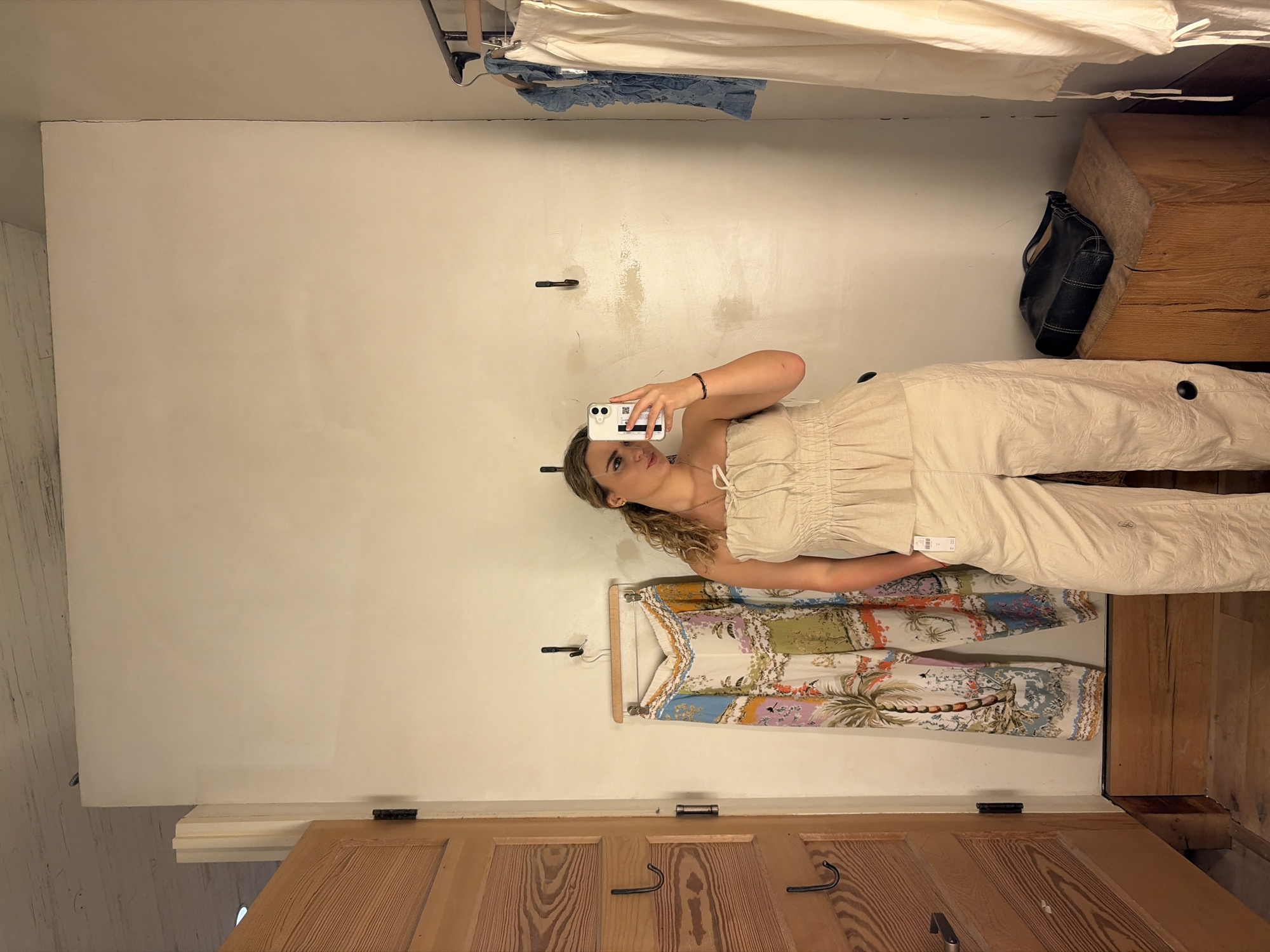 A woman stands inside a dressing room, holding a smartphone to take a selfie in the mirror. She's wearing a light-colored, two-piece outfit. Hanging on the wall is a colorful garment. The dressing room has a wooden door and is furnished with a wooden bench. A black bag is placed on top of the wooden bench. The specific location in Coral Gables, United States of America cannot be determined from the image alone.