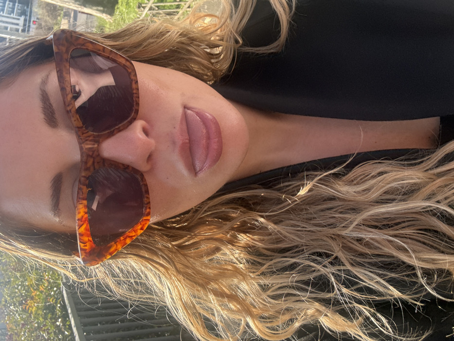 The image presents an adult female in a close-up, positioned outdoors under bright, direct sunlight in Nanterre, France. She is directly facing the camera with her tongue extended outwards from her mouth. Her eyes are obscured by cat-eye style sunglasses featuring a brown and orange tortoise-shell pattern and dark, reflective lenses. Her long, wavy hair, primarily blonde with lighter streaks, is visible, with strong highlights suggesting sun exposure. She wears a dark-colored garment, possibly a blazer or jacket, visible around her neck and upper chest. The background is out of focus, revealing a dark metallic railing on the left, consistent with a balcony or elevated walkway. Beyond the railing, blurred green and autumnal foliage is visible, and in the upper right, several modern, multi-story urban buildings are discernable, characteristic of a developed city environment.