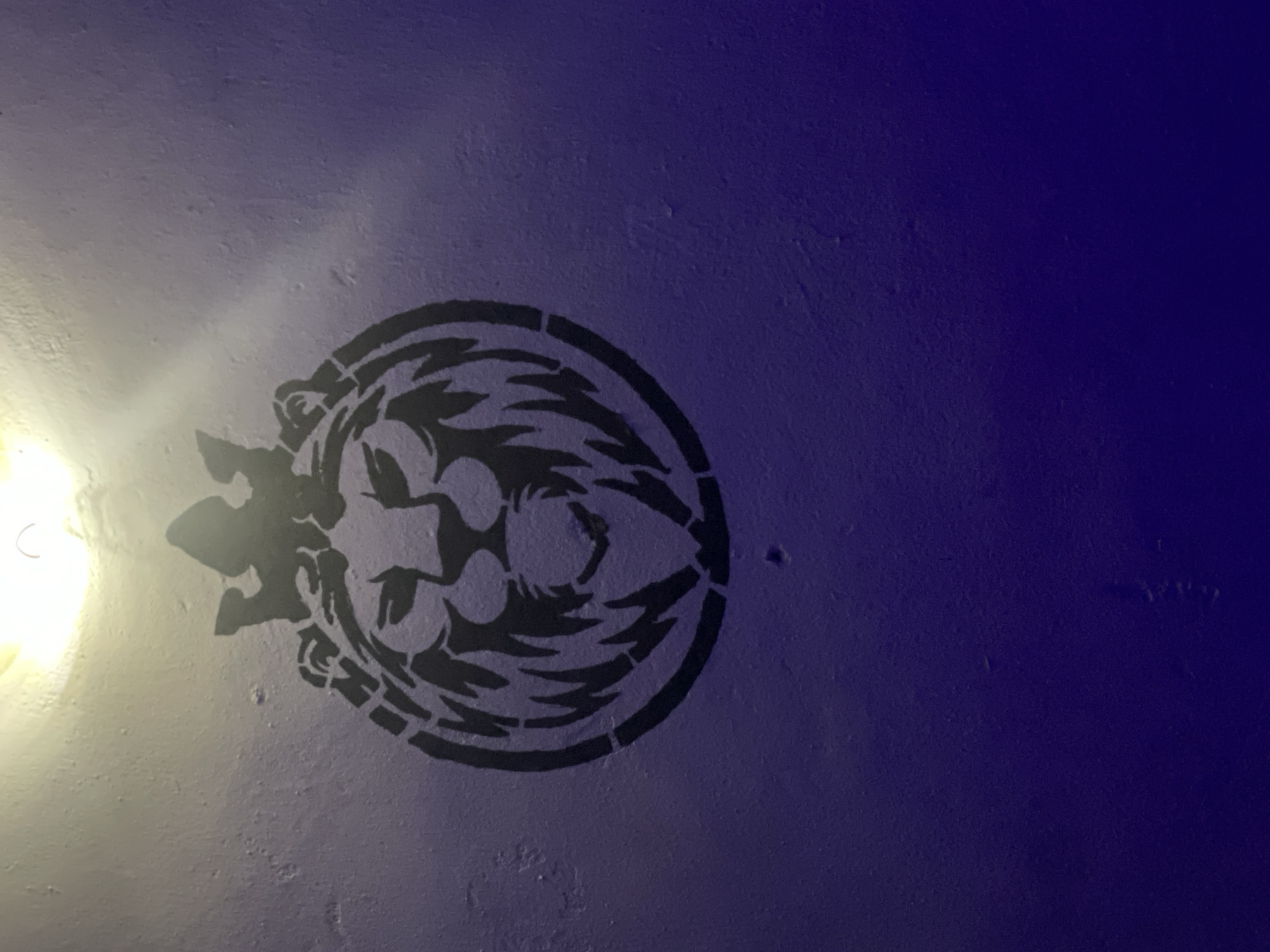 The image displays a textured wall in Jos, Nigeria, featuring a black stencil or decal of a crowned lion's head