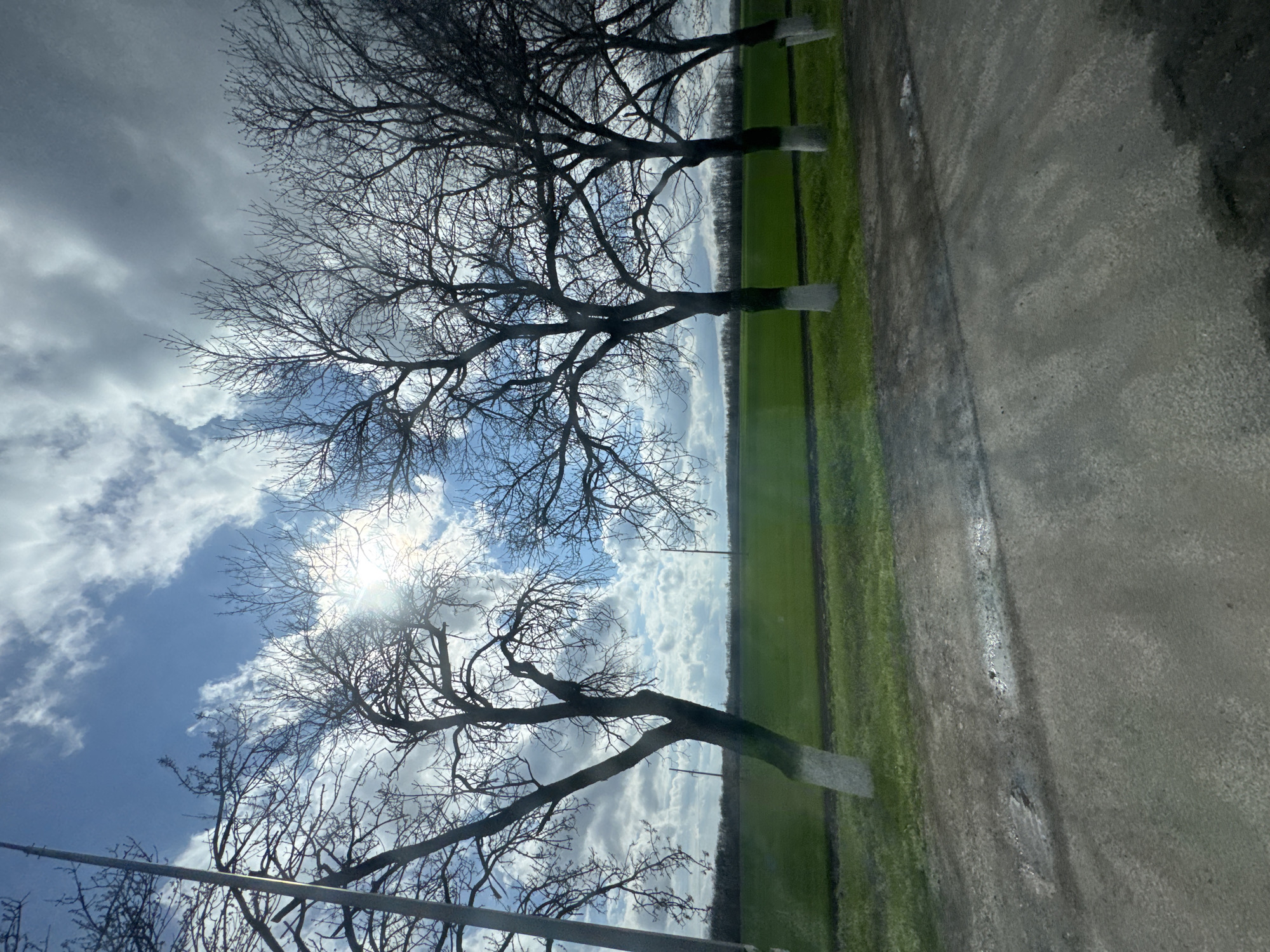 The image depicts a rural scene, possibly in the vicinity of Armavir, Russia, based on context. The foreground contains a paved road surface. Beyond the road, a field of green vegetation stretches into the distance. Several bare trees with whitewashed trunks line the road and field edge. The sky is visible above the trees, featuring a combination of blue sky and scattered white clouds, with the sun partially obscured by the clouds. No people are visible in the scene.