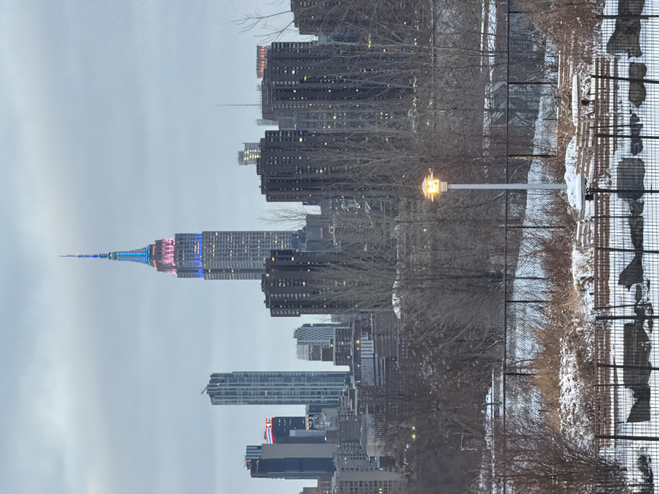 A rotated view of a cityscape featuring the Empire State Building illuminated with blue and pink lights. Various other buildings rise in the background. In the foreground, bare trees and a park scene with a fence and snow-covered ground are visible. A single street lamp is lit among the branches. The sky is overcast.