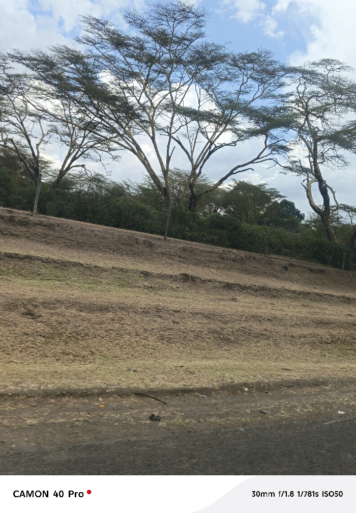 The image depicts an outdoor natural landscape in Malewa West ward, Kenya, under a partially cloudy blue sky. In the immediate foreground, a dark, horizontal strip of ground, possibly a road edge or compacted earth, is visible, with small scattered debris including twigs and light-colored specks. Above this, a gradual uphill slope dominates the midground, characterized by dry, yellowish-brown grass and exposed light brown soil. The slope exhibits multiple horizontal, undulating contours, suggesting terracing or erosion patterns. Patches of greener vegetation are sparsely interspersed among the dry grass. Further up the incline, forming a dense background, is a line of dark green shrubs and smaller trees. Towering above these and extending across the upper frame are several mature, large-branched trees, consistent with Acacia species, displaying light-colored trunks and branches with relatively sparse, dark green foliage forming wide canopies. No individuals, animals, or active interactions are visible in the scene. The overall environment appears rural and arid, captured during daylight hours.
