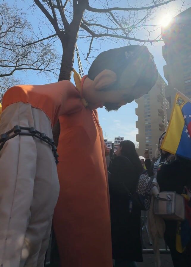 protest march, likely political in nature. At the center is a life-sized doll of a man in an orange shirt and white pants, apparently meant to represent a prisoner. The doll is suspended with a noose around its neck. The doll also has chains wrapped around its body, suggesting imprisonment. Venezuelan flags are visible, and a sign saying “Free Press” is also displayed. The scene takes place in a city with buildings visible in the background on a bright, sunny day.