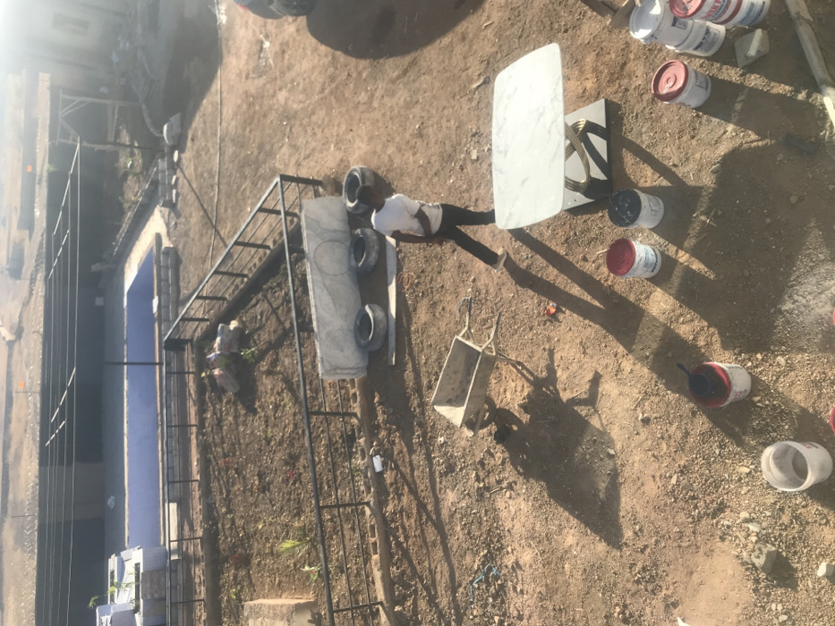 An overhead shot reveals an outdoor construction site. A pool is visible in the background. Various construction materials are scattered around, including paint cans, a marble table top, and tires. A man stands between the marble tabletop and a metal frame with tires. A wheelbarrow sits nearby. The ground is dirt. The lighting suggests it is a sunny day.
