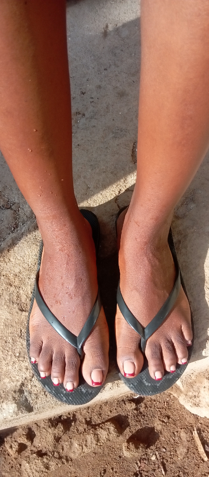 An overhead photograph depicts a pair of human lower legs and feet, oriented with toes facing away from the viewer, on an outdoor surface in Akwanga, Nigeria. The individual's skin is dark brown. Both feet wear black thong-style flip-flops. Toenails are manicured with a pale pink base and distinct dark red tips. Multiple small, clear liquid droplets are visible on the skin of the lower legs and the dorsal surface of the feet. The ground comprises a light grey, textured concrete or cement surface mixed with reddish-brown soil and small debris. Harsh sunlight casts sharp shadows across the scene.