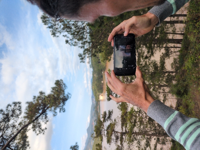 The image displays a person from a rear perspective, positioned at an elevated outdoor viewpoint within the city of Lán Tranh, Vietnam. The individual wears a grey long-sleeved garment featuring horizontal light green stripes on the forearm. Both hands are holding a black smartphone horizontally, its illuminated screen displaying what appears to be a camera interface capturing the surrounding landscape. The background reveals a expansive body of water, distinctively brownish-orange in color, indicative of a lake or large river. This water is bordered by numerous green pine trees, which also populate the immediate foreground and mid-ground. In the far distance, undulating mountains are visible beneath a partly cloudy sky, with patches of clear blue. A small, light-colored building stands on a landmass situated within the distant section of the water body. A pine branch extends diagonally into the upper left quadrant of the frame.