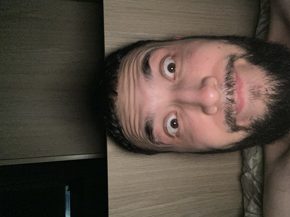 A man with a dark beard and brown eyes looks directly at the camera with a slightly quizzical expression