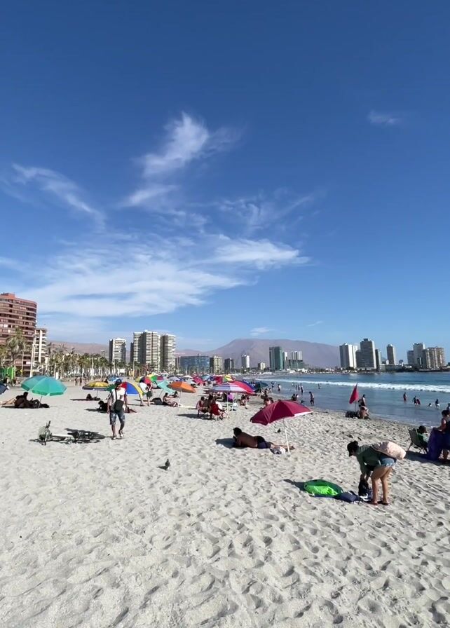 The video presents a view of a crowded beach on a sunny day. People are scattered across the sandy beach, some lying under colorful umbrellas and others sitting or standing. There are several buildings in the background, including high-rise apartments or hotels, forming a city skyline. A mountain can be seen in the distance behind the buildings. The sky is a clear blue with some scattered white clouds. The sea is visible with waves gently rolling in towards the shore.